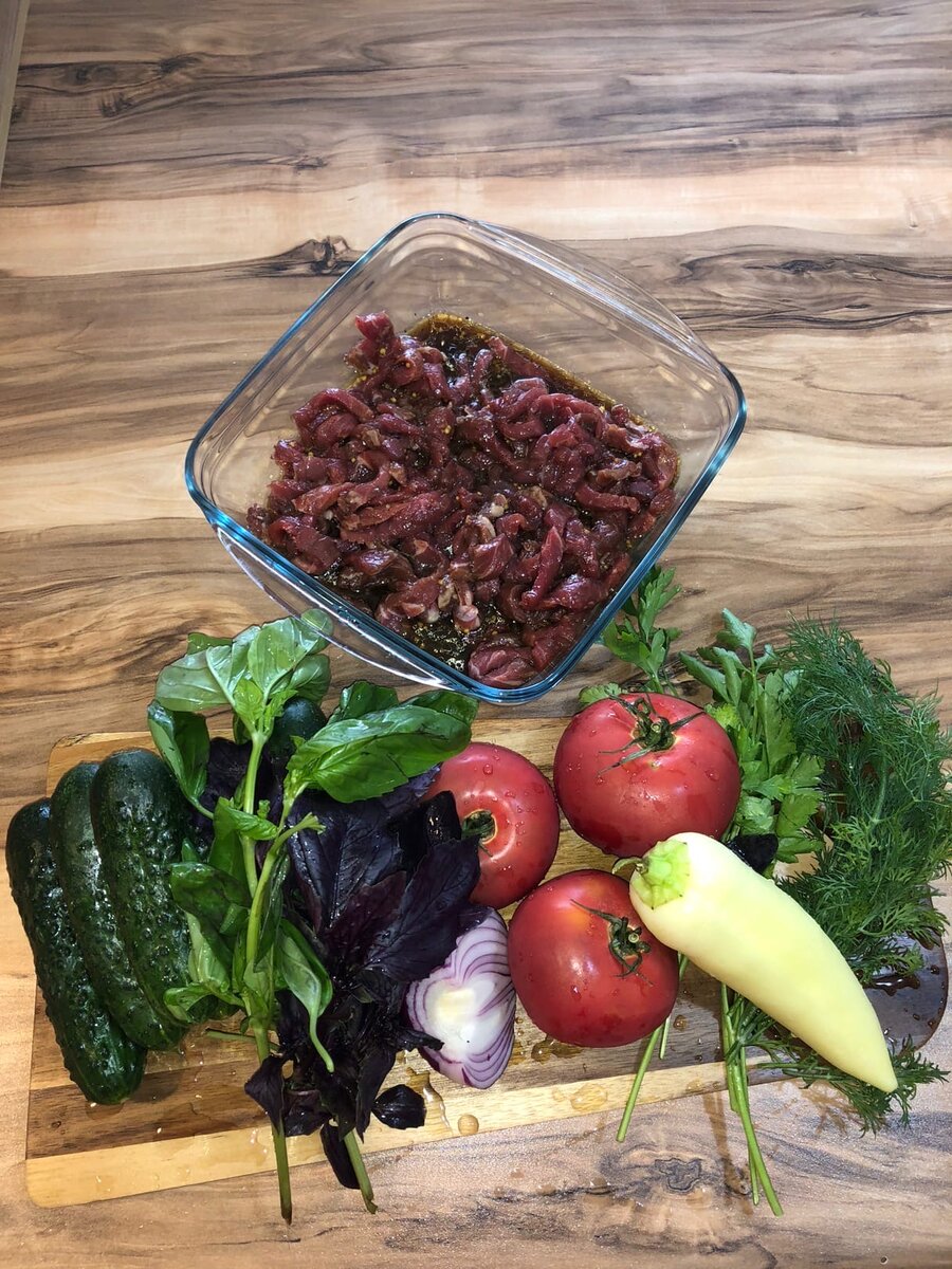 На улице жуткая жара. Хочется чего-то лёгкого, свежего, летнего, но при этом сытного. Лучше любимых овощей и ароматной зелени трудно что-то придумать, но мы придумали! ИНГРЕДИЕНТЫ: Маринад: Залог успеха практически любого мясного блюда - это правильный выбор мяса. Мы предпочитаем телятину, и для тёплого салата ничего лучшего чем филейная часть, как называют ее у нас - тонкий край, подобрать невозможно. Выглядит эта часть мяса вот так: Нарезаем мясо тонкой соломкой. Добавляем нерафинированное оливковое масло, соевый соус, дижонскую горчицу, солим и перчим по вкусу. Маринуем примерно 20-30 минут. Пока мясо маринуется, нарезаем овощи и зелень. Сочетание двух видов базилика придаст этому блюду просто потрясающий аромат! Важно: не надо солить и заправлять салат на этом этапе! Как только овощи нарезаны, разогреваем сковороду на сильном огне, при этом масло не добавляем. Мясо слегка отжимаем над ёмкостью и отправляем на раскалённую сковороду. Постоянно помешивая обжариваем 3-4 минуты. К