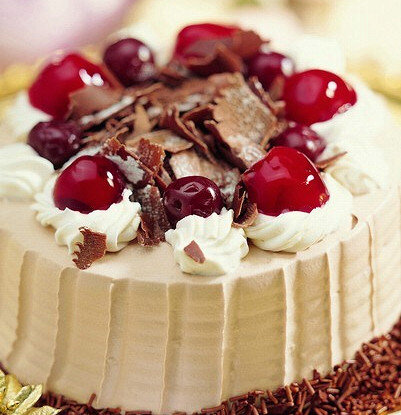 5. Сливки взбить с сахарной пудрой. Покрыть верх и бока торта взбитыми сливками, украсить черешней и полить сиропом.