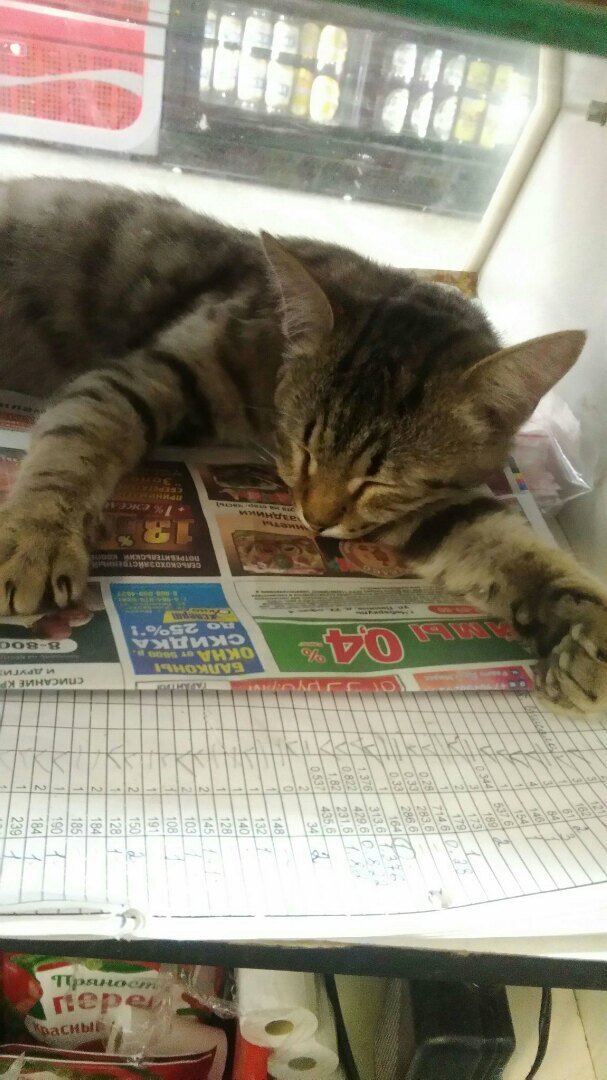 Прошло 14 дней, как я работала в соседнем магазине и подружилась с котиком. Первое время меня умиляло, что он уличный, но всегда опрятный и приходит в магазин на обед по часам. А когда уставал от непрекращающихся поглаживаний, забирался и спал в витрине.