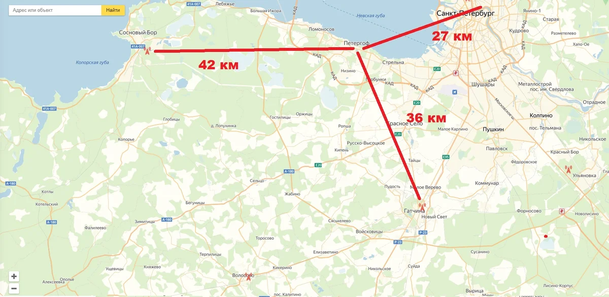 Например, из Петергофа можно направить антенну в направлении трех передатчиков (см. рис). Возможно, какое-то направление перекрывает препятствие, в другом слабый сигнал. Поднимите антенну повыше и поворачивайте в разные стороны! А информация об уровне сигнала поможет принять правильное решение!