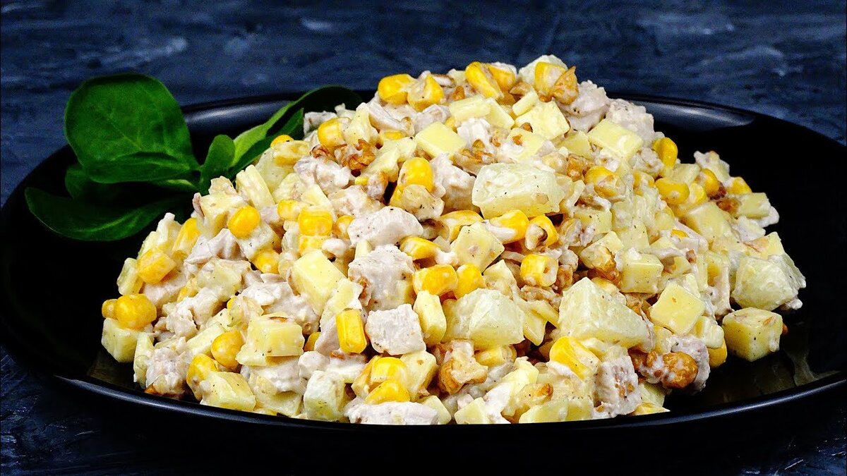 Ингредиенты: кукуруза консервированная 1 банка, ананас консервированный, филе грудки в/к куры 1шт, греческий йогурт для заправки(или майонез). Мелко нарезать копченую грудку. Добавить кукурузу и измельченный ананас ,заправить салат. ПРИЯТНОГО АППЕТИТА! ЧТОБЫ НЕ ПРОПУСТИТЬ ЕЩЕ БОЛЬШЕ ВКУСНЫХ РЕЦЕПТОВ-ПОДПИШИСЬ!