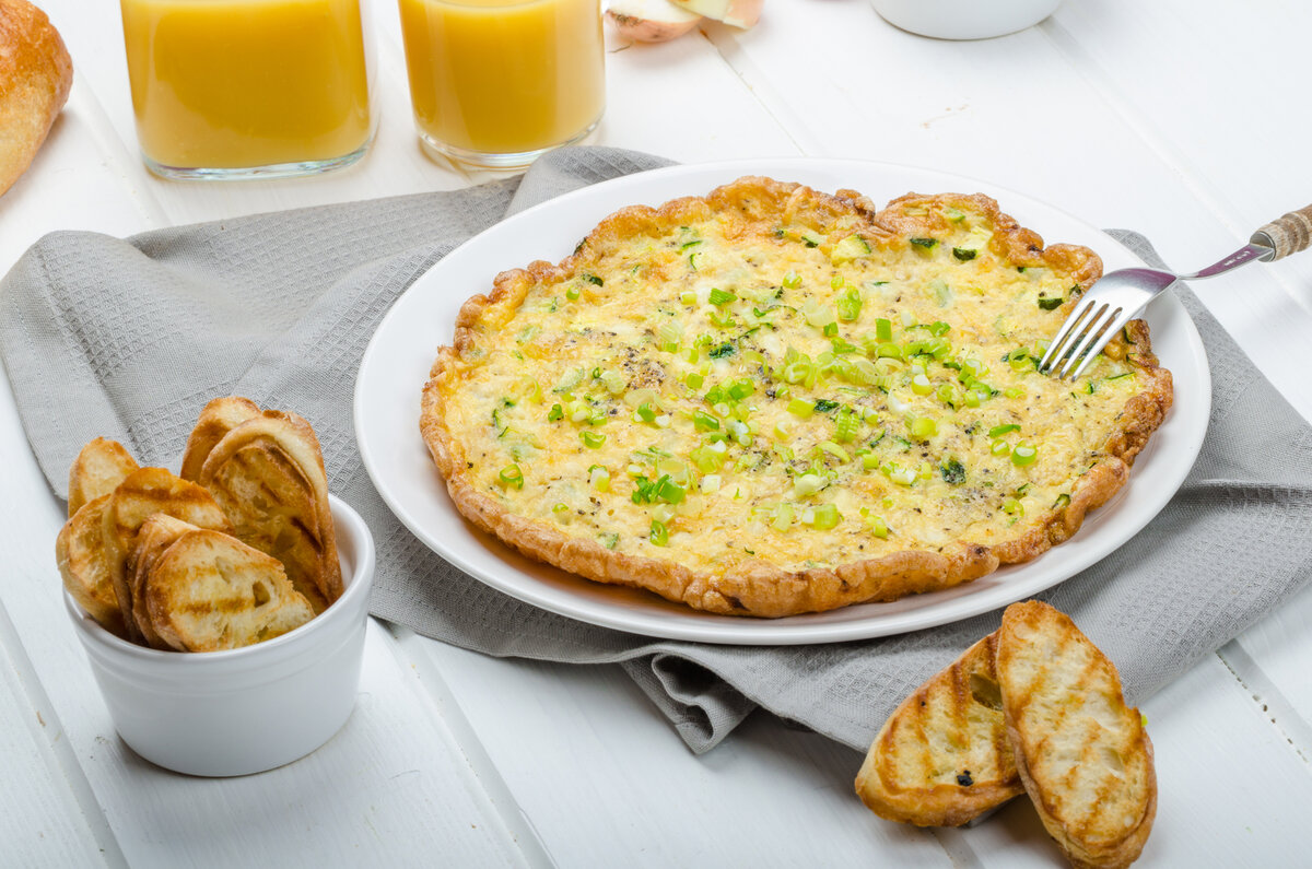 Отправляем омлет на разогретую сковороду, жарим на медленном огне. В конце можно перевернуть и поджарить буквально 1 минуту на другой стороне, если верх никак не зажаривается, а низ уже зарумянился.