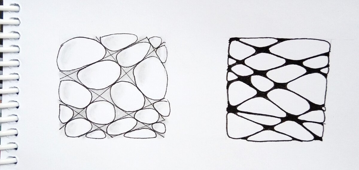 Давненько не выходило ничего в рубрике #рисуем просто дз Время исправиться. Помните тангл Nzeppel? Очень интересный, но при этом довольно простой паттерн. А ещё его можно использовать в качестве разметки для заполнения другими танглами пузырьков, из которых состоит Nzeppel. Но есть ещё один вариант. Его-то мы сейчас и рассмотрим. Можно наложить Nzeppel поверх какого-либо другого тангла. Пусть это будет, например, тангл Hurry Holly. Сначала довольно крупно рисуем тангл Nzeppel. А затем начинаем заполнять полосками Hurry Holly так, чтобы они продолжались из одной области тангла Nzeppel в другие. И так до тех пор, пока остаётся свободное пространство. Предлагаю и вам попробовать вписать в элементы тангла Nzeppel какой-нибудь тангла. А лучше — сделать это с несколькими танглами. И не забывайте делиться результатами. Приятного творчества!