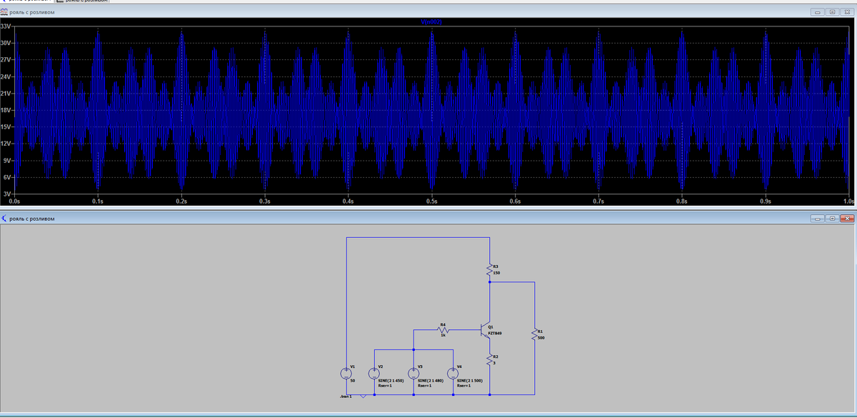 Слева направо, сначала источник питания, далее 3 источника синуса, как обычно смещенного вверх, чтобы цепь смещения не делать, далее резистор имитирующий выходное сопротивление магнитофона, винил-корректора и прочих источников музыкального сигнала. Далее уже привычный, тем кто читал мои Аудиофильские Инженерии, транзистор, над ним резистор падения напряжения, ответственный за раскачку амплитуды, под ним резистор обратной связи по току, позволяющий управлять коэффициентом усиления каскада и нормализовать некоторые его параметры, ну и резистор на 500 ом имитирующий выходной каскад с нагрузкой на 8 ом.