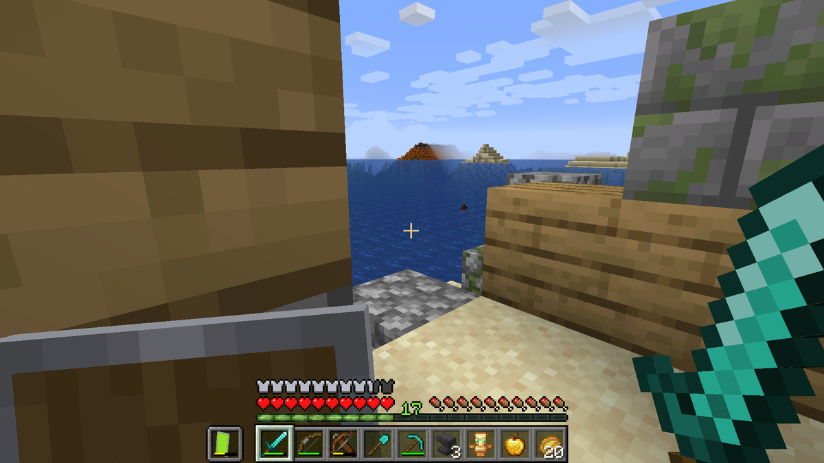 Привет! Я начал думать: плыть без лодки и вытыкать трезубцы из своей спины или вернутся в оазис, но получить от кубов. Я решил остановится на первом варианте! Но утопленники столпились прям у берега и не давали мне проплыть вперёд! А ещё у одного из них я отобрал золотой слиток. И очередной утопленник с трезубцем не заставил себя долго ждать. Этот противник был намного сильнее. даже щит не помогал. После его убийства на меня набросились все утопленники. И "рыбаки", и с ракушками набросились на меня! Ну а я прыг в воду. После этого я поплыл без оглядки в мессу. Хотя, я всё-таки немного поглядывал за ними. Через две минуты я уже подплывал к жаркому острову. За мной ещё был "хвост", который состоял только из самых маленьких, быстрых и ловких. Но на берег они конечно-же залазить не будут! Как вы думаете, что может испортить этот прекрасный и очень жаркий день? Я уверен на 84%, что вы не угадали. Этот день испортила холодная и беспощадная ночь! А это мини-мини-мини данж, который практически