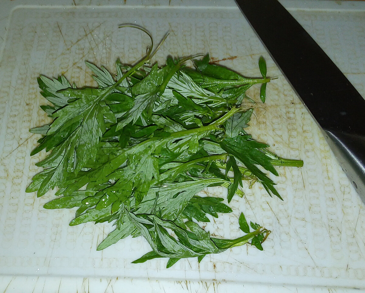 Берем молодые побеги полыни с листьями и измельчаем