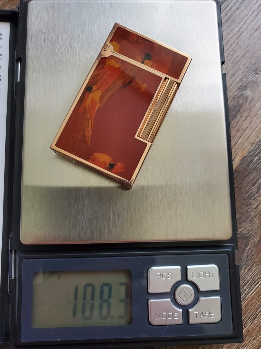 Оригинал полноразмерной зажигалки с отделкой драгоценным китайским лаком или палладием (есть и уменьшенные, такого-же размера как Gatsby) весит 110 грамм. (106-112 грамм в зависимости от точности весов и заправлена ли она, но не больше. Если Ligne 2 весит 130-140 грамм, то перед вами на 100% подделка.