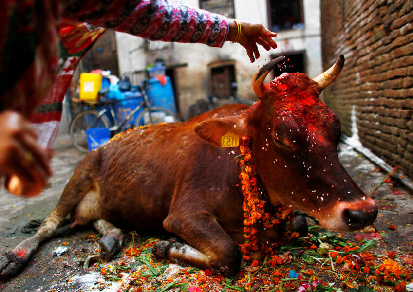 В Индии Священная Корова считается Великой Матерью, силой, защищающей и питающей своё потомство. Но почему корова заслужила такую честь? Потому, что она - "вегетарианка", у неё добрый нрав, и она даёт людям молоко, не прося никакой благодарности. Убийство коровы в Индии - это тяжкое преступление. Коровы в Индии повсюду: они смотрят со стен храмов, лежат на центральных улицах, безразлично глядя на потоки несущихся справа и слева оглушительно ревущих машин, мотоциклов.