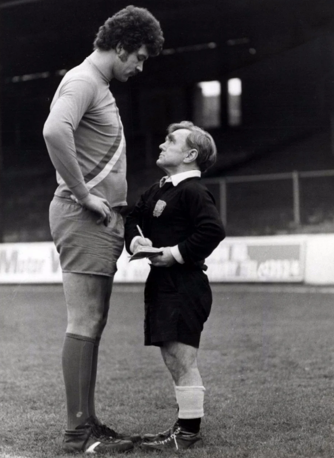 Здесь мы видим как футбольный арбитр Джоуи Шаклфорд, рост которого не дотягивал даже до полутора метров, выносит предупреждение игроку Клайву Годдарду - двухметровому гиганту, ростом два метра, шесть сантиметров. Снимок сделан в Англии в 1980 году.