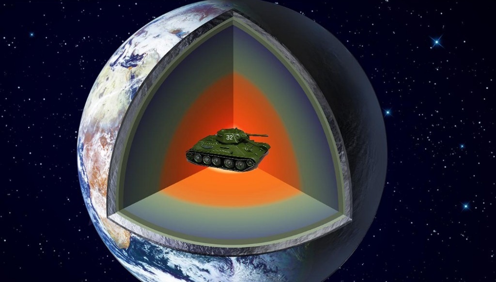 Представим же наконец-то, что т-34 каким-то необъяснимым образом оказался в центре Земли. Допустим, он получил неуязвимость и может там находится, не боясь сгореть за 1 секунда или же разорваться на части.