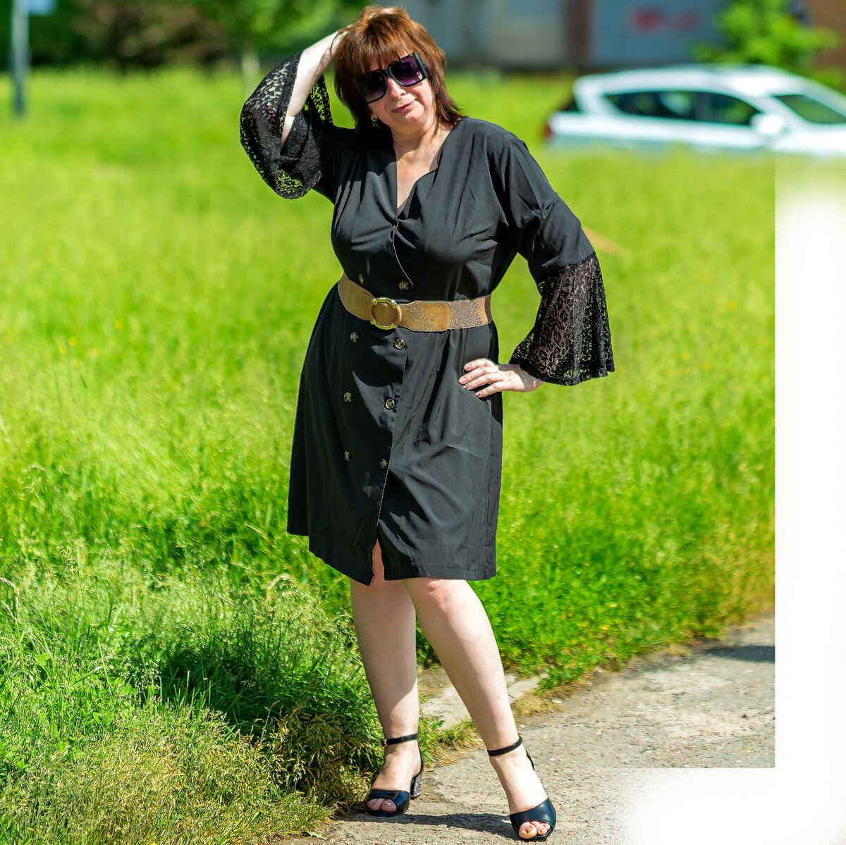 Заказываю не в первый раз, на этот — для еще одной подруги) Платье заказала в своем любимом магазине. Так как у меня уже есть такое платье (может кто помнит мой осенний обзор), это платье заказала для еще одной подруги, ей очень приглянулась данная модель. Трекномер отслеживался на всем пути, посылку получала на почте. Платье пришло в фирменном пакете, при распаковке никакого запаха не было. Платье полностью соответствует фото на странице продавца. Материал шелковистый, не тянется. Состав 95% полиэстера и 5% спандекса. Немного электризуется к телу, лучше все же воспользоваться антистатиком. Цвет не чисто черный, немного отдает в темно-серый оттенок. Кружево черное, мягкое, с рисунком. На параметры подруги выбрали размер 3XL. Подруге платье отлично подошло, но я покажу его вам на себе. На мои параметры 104-94-114 платье село очень свободно в груди и талии, из-за этого вырез на груди распахивается, поэтому я его подколола, а само платье показываю с поясом. Но пояс в ко