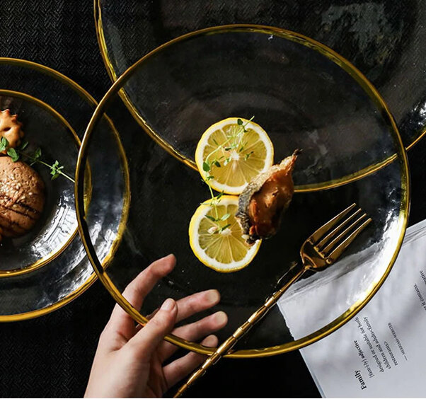 Большие и прозрачные тарелки с золотой каемкой