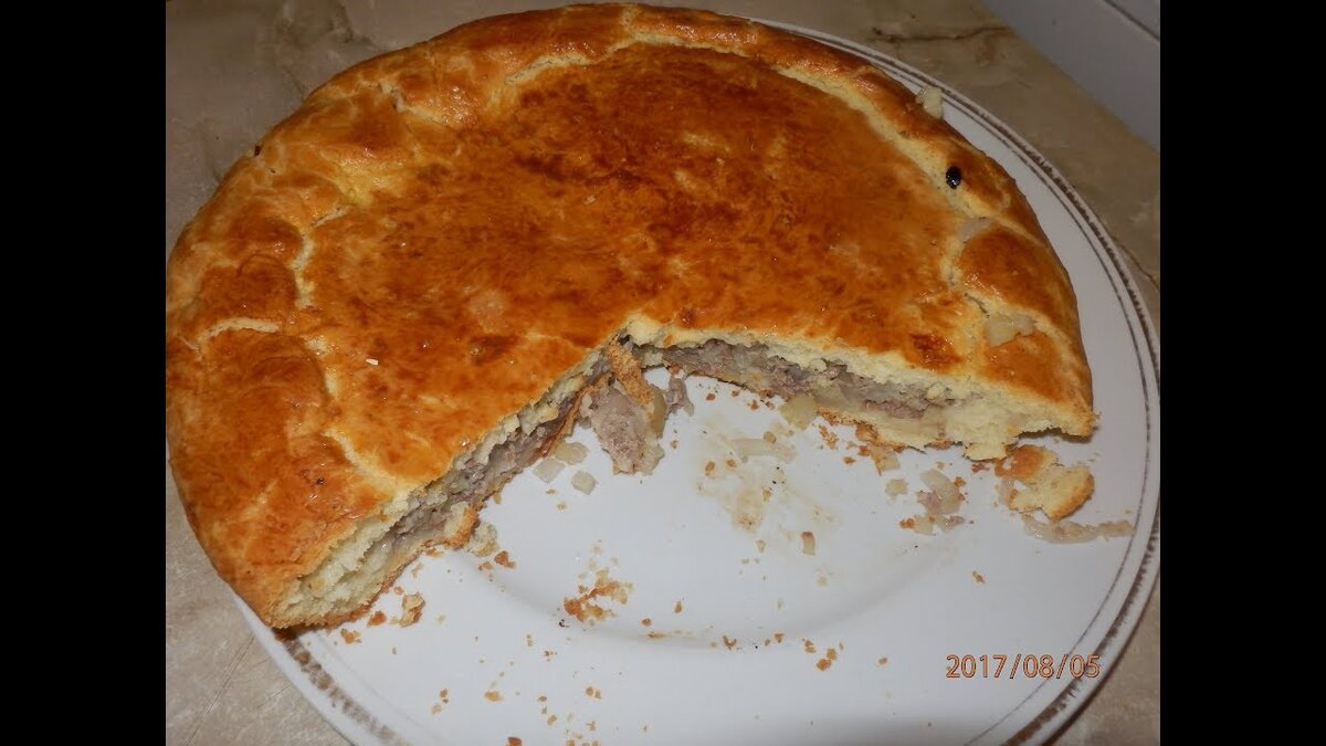 Форму для выпечки смазать маслом и выложить половину теста. Теперь ровным слоем выложить начинку из мяса и картошки. Накрыть оставшимся тестом. Оставить наш пирог на 15 минут при комнатной температуре, а затем отправить в разогретый духовой шкаф (180 градусов) на 50-60 минут. Готовность выпечки проверить зубочисткой. Если верх пирога начнет пригорать, то прикрыть фольгой.