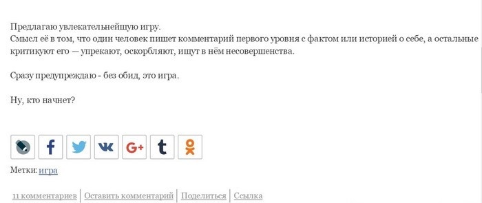 Игра в мудаков - новое явление в сети. Предложила его журналистка Алина Фаркаш. Суть занятия в том, что человек писал какой-то обыденный, желательно позитивный факт со своей жизни, а остальные участники должны были его прокомментировать. Но с одним условием. Никаких: "молодец!", "Как я рада за тебя", "Счастья вам и любви!"... Только жесткая циничная критика. Знаете что с этого вышло - около 600 комментарий под постом. Люди сегодня настолько озлобленные серыми буднями и собственными неудачами, что ищут всевозможные способы выплеснуть негатив на сторону. И все равно, близкий это человек или незнакомец в сети. Психологи объясняют это синдромом снежного кома. Наши бабушки, дедушки, затем родители достигли огромных достижений в искусстве обесценивания любых достижений - чужих или собственных. Такая модель общения зарождалась в нашем обществе постепенно и на основании очень многих социальных и исторических фактов. Много ли ваших родственников радовались, когда вы нашли первую работу или созд
