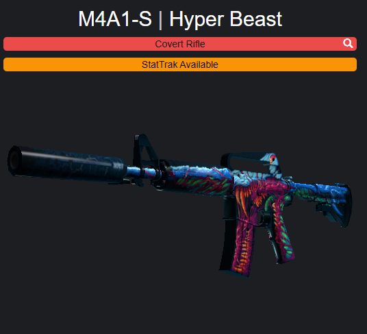 Привет! Сегодня я тебе покажу 3 красивых скина на M4A1-S! 1. M4A1-S | Hyper Beast Коллекция из хромированного кейса #2 Бесшумный карабин M4A1 оснащен менее вместительным магазином, чем его аналог без глушителя, зато он обеспечивает более тихую стрельбу с меньшей отдачей и повышенной точностью. Нанесено изображение чудовища в ядовитых красках. «Хочешь удивить меня, Бут? Сделай эту пушку чувствительной к ультрафиолету», — Рона Сабри, многообещающий военный Айтем варируется от 700 руб (в кач-ве "закаленный в боях") до 5600 руб (в кач-ве "Прямо с завода") 2. M4A1-S | Master Piece Коллекция «Overpass» Бесшумный карабин M4A1 оснащен менее вместительным магазином, чем его аналог без глушителя, зато он обеспечивает более тихую стрельбу с меньшей отдачей и повышенной точностью. Рисунок в виде вызывающего граффити нанесен вручную. Айтем варируется от 1900 руб (в кач-ве "закаленный в боях") до 10500 руб (в кач-ве "Прямо с завода") 3. M4A1-S | Golden Coil Коллекция из тёмного кейса Бесш