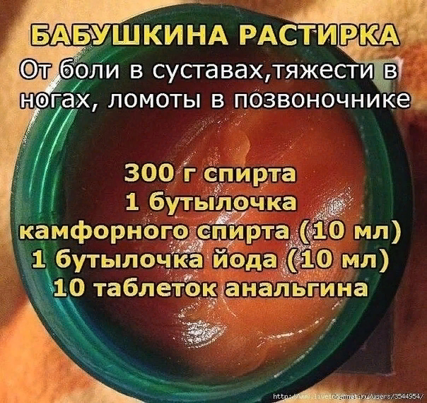 Вот рецепт этой растирки. Она лечит все: радикулиты, артриты, артрозы, остеохондрозы - все, что связано с суставами и костной тканью. 300 г спирта, 1 бутылочка камфорного спирта (10 мл), 1 бутылочка йода (10 мл), 10 таблеток анальгина.