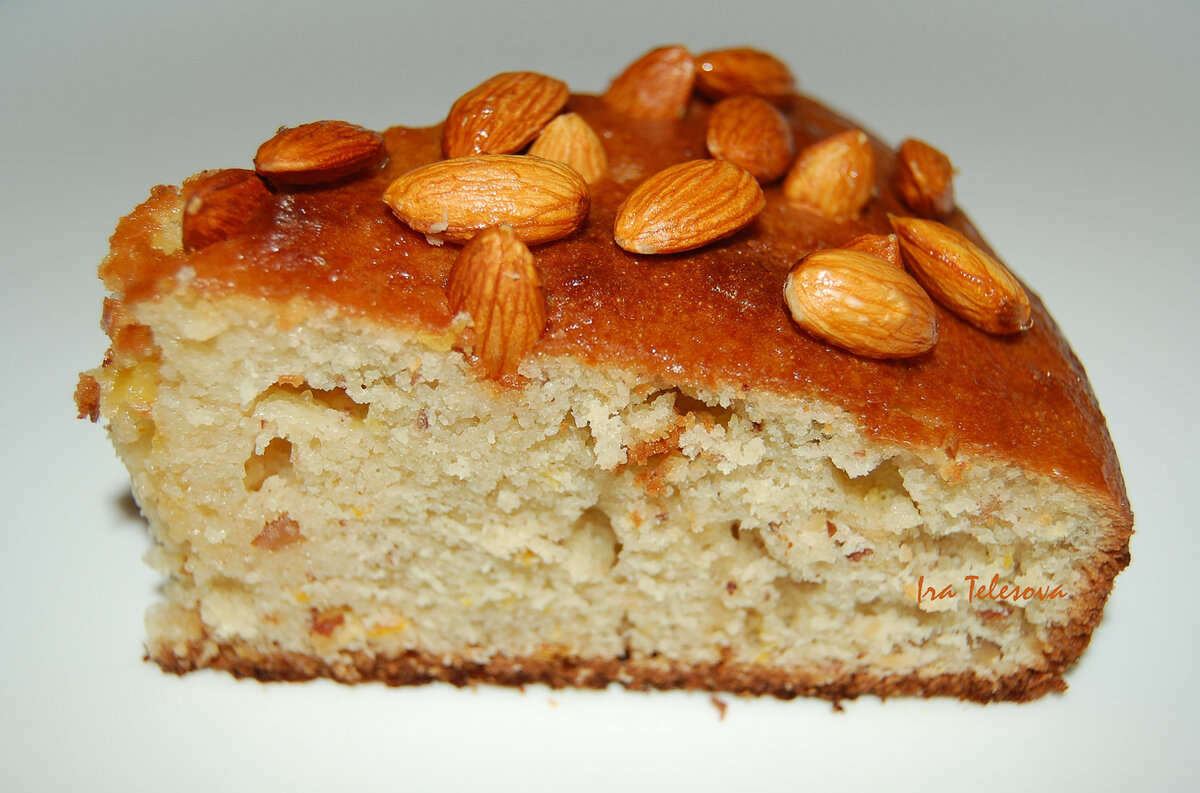 Смешать все сухие ингредиенты: 75 гр миндаля (смолоть, но не до муки, а до небольших кусочков) + цедра 1 лимона и цедра 1 апельсина (натереть на тёрке-строгалке, но не затрагивая белого подкоркового слоя) + 250 гр муки + 200 гр манки + сода.