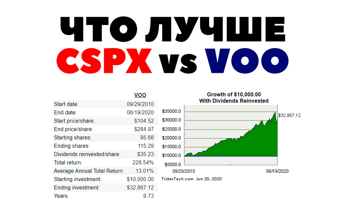 Сравним инвестирование в два индексных фонда на S&P500 - CSPX, который является реинвестирующим дивиденды фондом (дивиденды не выплачиваются, а реинвестируются внутри фонда) и VOO, который я считаю лучшим индексным фондом на S&P500 в принципе. Вадим спрашивает: какой из них лучше и какой из них более доходный? Обратимся к реальным цифрам статистики. Увы, напрямую сравнить эти фонды не представляется возможным. Они торгуются на разных биржах, а потому типовые сервисы сравнения для этого не подходят. Будем использовать комбинацию: сравнение через сервис и прямые расчеты. Прямые расчеты по CSPX сделать очень легко. Так как ETF реинвестирует дивиденды, то достаточно взять стартовую сумму (и стоимость актива) на начало периода, а затем итоговую сумму на конец периода. И по формуле XIRR рассчитать доходность. Сделаем расчет на примере инвестиций в 10000$. Фонд был запущен в 2010 году, так что это мы и берем, как стартовую базу. Инвестор мог бы купить около 103 паев фонда на 10000 долларо
