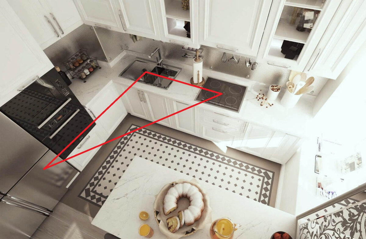 Поэтому во главу угла ставят правило треугольника – мойка, плита и холодильник должны быть равноудалены, причем площадь этого треугольника не должна превышать 5-7 квадратных метров.