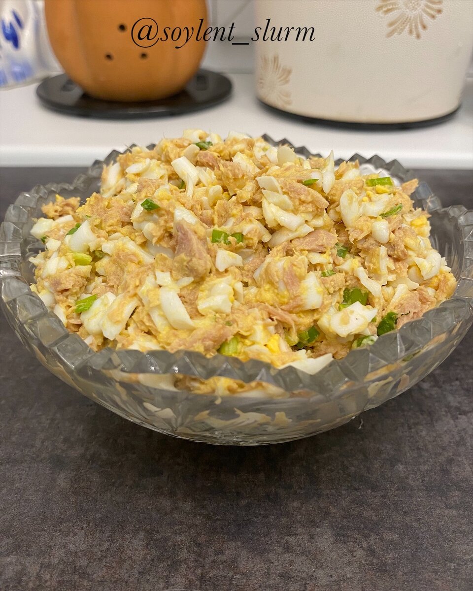 Для заправки: смешать желтки, горчицу, заливку от консервы и ошпаренный, мелко порезанный лук. Получился воздушный, легкий, очень вкусный "майонез". Им и заправляем салат.