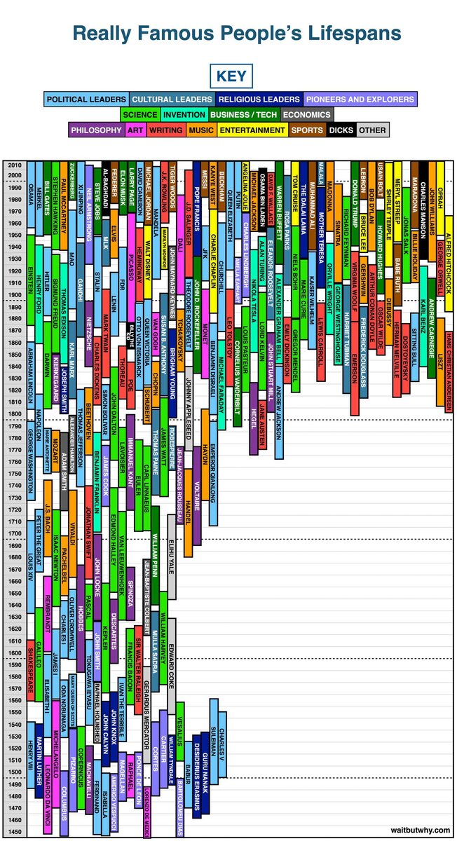 Мы с вами находимся в верхней части графика, вместе с Обамой, Меркель, kanye west, Бекхэмом, Стивом Джобсом, а нет, он уже умер, да да, верхняя часть графика лишь говорит о том что мы homo sapiens которые родились, но еще не умерли, жестко, в третьих этот график нам показывает кто кому отец а кто кому дед, Дарвин мог бы приходиться дедом Ленину и даже Сталину и так можно со всеми личностями, приглядитесь и вы увидите как известные личности рассказывают о своей эпохе, вот 1500 год, пока Коперник доказывал что земля вращается вокруг солнца, Микеланджело писал на потолке Сикстинской капеллы знаменитую фреску "Сотворения Адама"
