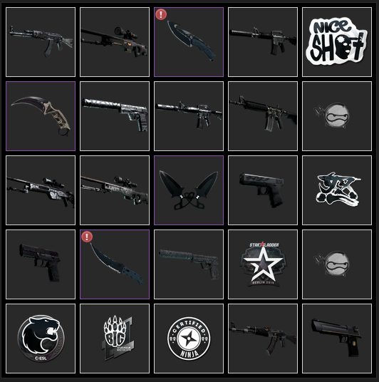 Доброго времени суток! Сегодня я постарался собрать инвентарь для настоящих ниндзя. Минимальная стоимость без ножа ≈ 809 руб Минимальная стоимость с ножом ≈ 6809 руб Итак начнем АК-47 Тут есть два варианта: дорогой и дешевый. Черный глянец. Очень старый скин, был выпущен в 2013 году. При покупке легко можно найти вариант с хорошими стикерами. Цена ≈ 1300 руб (после полевых испытаний) Элитное снаряжение. Относительно новый и недорогой, но от этого не менее черный скин. Цена ≈ 130 руб (после полевых испытаний) M4A4 Есть бесплатный вариант - по дефолту M4A4 черная, но так неинтересно. Центральный процессор. Мне очень нравится этот скин, плюс к этому он очень дешевый. Цена ≈ 19 руб (прямо с завода) M4A1-S Опять можно использовать дефолтную M4A1-S. Тёмная вода. К этому скину мы еще сегодня вернемся. Это одна из моих любимых раскрасок. Тоже очень старый предмет - 2013 год. От этого и высокая цена. Преимущества: возможность найти с хорошими стикерами; возможность найти с красивым паттерном,