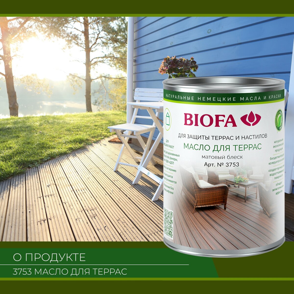 Терраса – важное дополнение загородного дома. А дерево – материал, проверенный годами. Но древесина для террасы требует особой защиты, так как она постоянно подвержена активному внешнему воздействию. Масло идеально подходит для этих целей, оно обеспечит древесине прочность, защиту от влаги и солнца, привлекательный вид. Компания BIOFA имеет в ассортименте специальное Масло для террас 3753 - это высококачественное покрытие на основе масел и смол для защиты деревянных настилов на террасах, балконах, верандах, причалах, помостках и прочих горизонтальных поверхностей из европейских пород древесины. Используется для пропитки нового, еще необработанного дерева и обновления древесины, ранее обработанной маслами; Изготовлен из природных, натуральных компонентов, не вызывает аллергической реакции как у людей, так и у животных; Глубоко пропитывая дерево, укрепляет его естественную структуру; Не образует пленки и позволяет дереву «дышать» Надежно защищает поверхность от биопоражений: плесени,