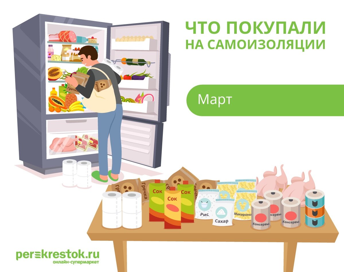 В середине марта неопределенная эпидемиологическая ситуация подстегнула клиентов онлайн-супермаркета запасаться впрок продуктами длительного хранения и бытовыми товарами первой необходимости, а также заранее обеспечивать себя минимальными подручными средствами безопасности. В потребительской корзине появились гречка, рис и сахар-песок (по 3 упаковки), туалетная бумага (2 упаковки), макароны (4 упаковки), курица (2 шт.) и соки (4 пакета). Наиболее популярными в этот период были консервы для кошек (21 шт. в заказе), питьевая вода (9 бутылок различного объема на один заказ), молоко и минеральная вода (по 7 шт. в заказе), а также глазированные сырки (6 шт. в заказе). Эти же товары оставались в лидерах в апреле и мае.