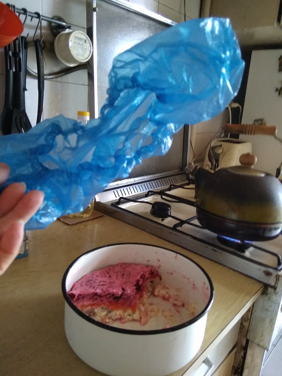 Признаюсь сразу: это не я придумал, а моя тёща. Девайс получился очень полезный, практически на уровне изобретённой мною одноразовой разделочной доски. Надеюсь, вы сумели оценить всю глубину моей скромности. (шутка) Итак: берём селёдку под шубой в тазике (салат тоже тёща готовила). Искать на него крышку? Зачем? Для этого у нас есть бахилы! Вуаля! Дёшево, просто и эффективно.