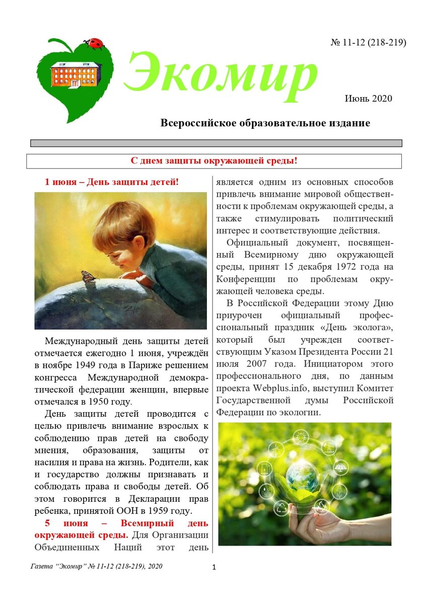 Уважаемые читатели, представляем вашему вниманию июньский номер всероссийского школьного экологического издания газеты «Экомир« — № 11-12 (218-219). Июнь 2020. В номере: Так же в приложениях: Прочитать или скачать PDF-файлы с очередным номером "Экомира" вы можете в статье на нашем сайте. ___________________________ Уважаемые читатели, не забывайте кликнуть"Подписаться" на наш канал.