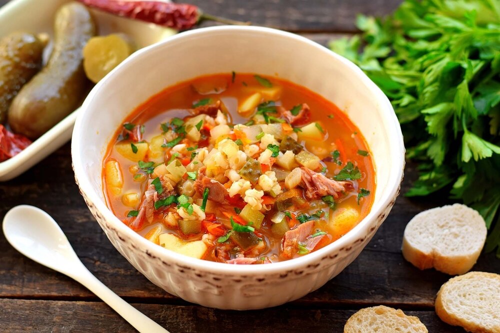Рассольник - слово русского происхождения, появившееся в лексиконе и закрепившееся в 19 веке. До этого традиционный кислый суп называли "кальей", которую готовили на любом рассоле или добавляли лимонный сок (традиционный рассольник в современном формате готовится только на соленых огурцах). Прижился рассольник в России быстро. Только рецепт его еще долго варьировался в зависимости от вкусов поваров. Кроме огурцов и кислой основы, добавляли картофель, морковь, лук, репу, большое количество всевозможных пряностей и зелени (сельдерей, петрушка, укроп, щавель, чабер, эстрагон). В качестве крупы могли использовать перловку или овсянку. В рассольник могли добавлять почки и говядину (тогда лучше дополнять суп перловой крупой), потроха курицы, индейки и другой птицы (для этого рецепта больше подойдет рис), свинину, баранину, птицу «с косточкой (традиционно в качестве дополнения использовалась овсяная крупа). Мясо желательно варить с костями. По завершению варки их устраняли, а мясо мелко рез