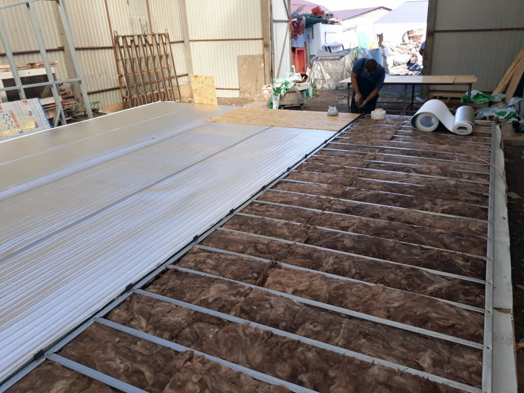 В начале собирается каркас из ЛСТК, заполняется утеплителем и обшивается ОСБ-плитами. Центральная часть дома, в которую входит коридор и санузел собирается в первую очередь. Затем, при помощи специальных петель, прикрепляются левое и правое крыло. Будущие