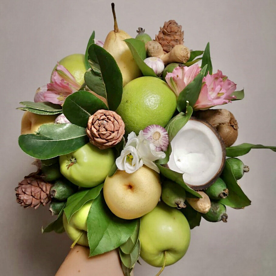 Он хорош с любыми фруктами и ягодами: яблоками, грушами, бананом, виноградом, клубникой, манго, апельсином. Дополняет букеты с орехами и сухофруктами.