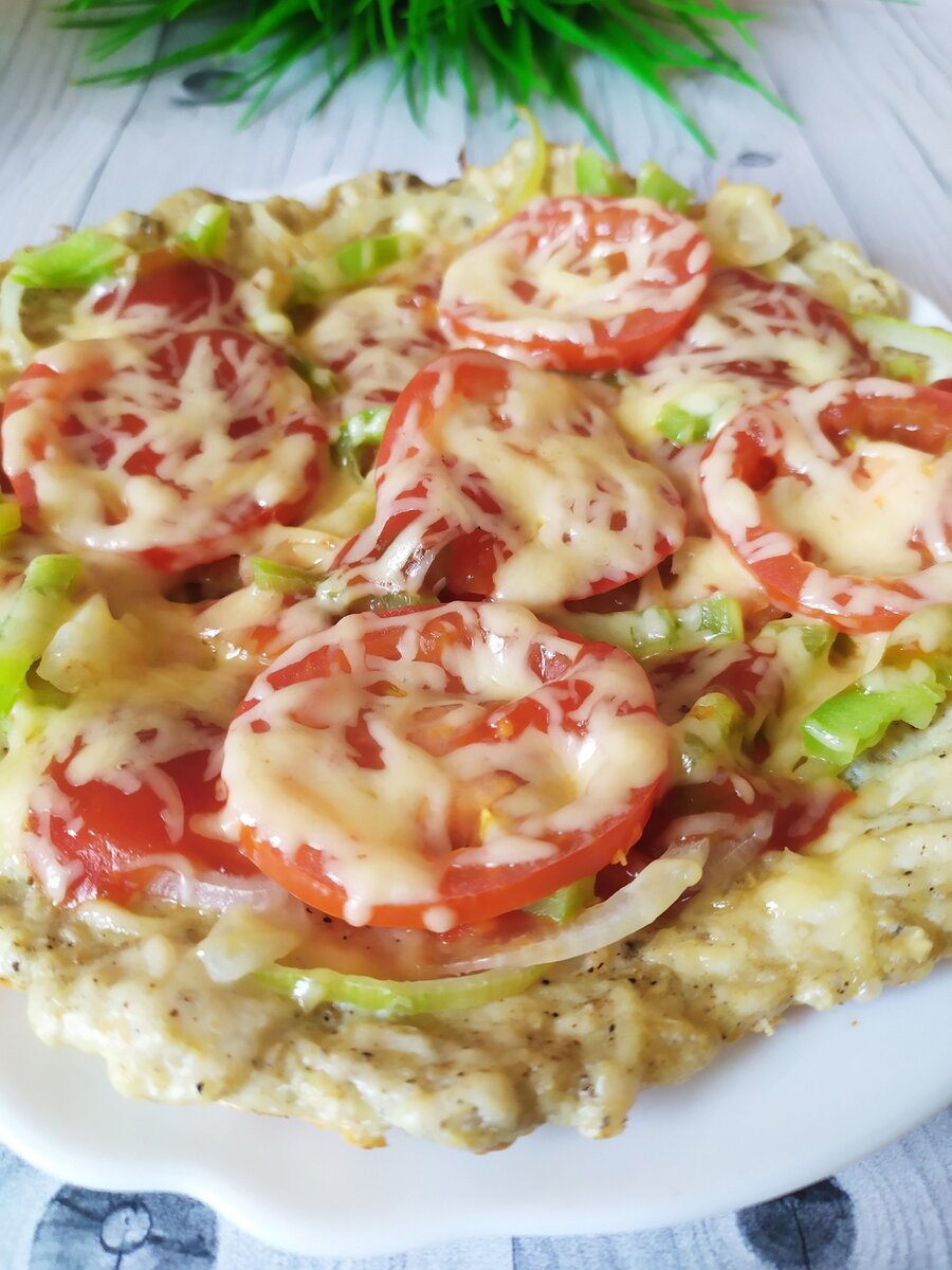 4. Выложить смесь из куры, овса и яйца, распределить по сковородке, чтобы получился блин. У меня он вышел чуть-чуть меньшего диаметра, чем сковорода. На блин сразу выложила лук и перец, чтобы они уже готовились.