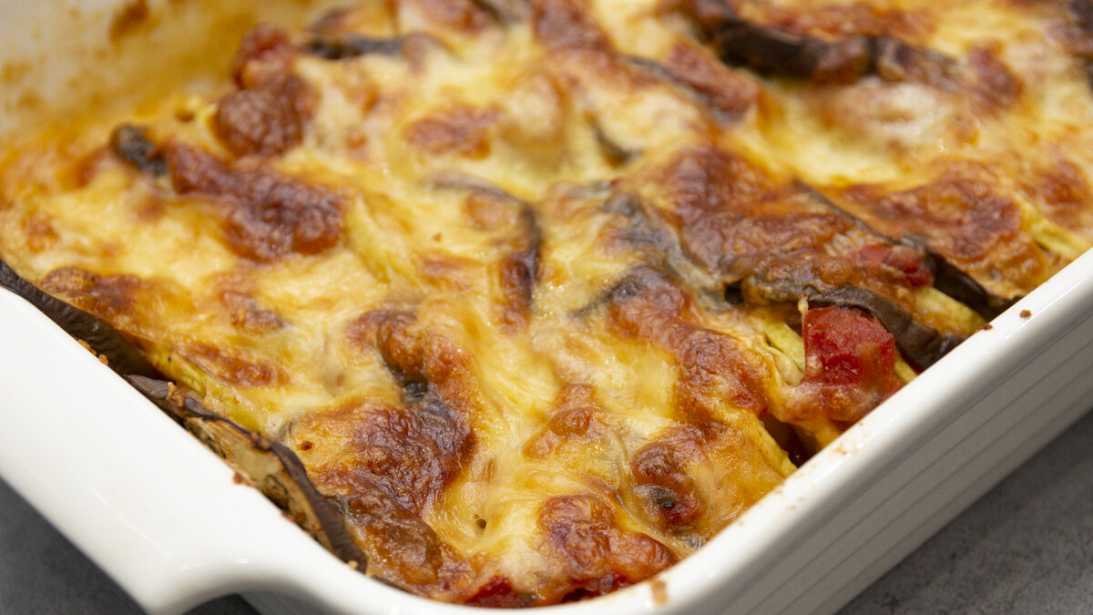 Через 45 минут снимаем фольгу и посыпаем овощи тёртым сыром. Не меняя температурный режим, запекаем овощи под сыром ещё 10-15 минут до образования румяной сырной корочки.