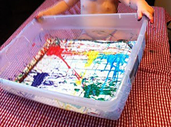 Еще один увлекательный способ рисовать с детьми и одновременно развивать воображение и координацию движений. Для этого вам понадобится шарик, краски, коробка и лист бумаги, вырезанный под ее размер. Шарик можно макать в краску или наливать ее сверху, непосредственно на лист бумаги. Катаясь в коробке, шарик создает картину. Вот такие замечательные каракули выходят в итоге.