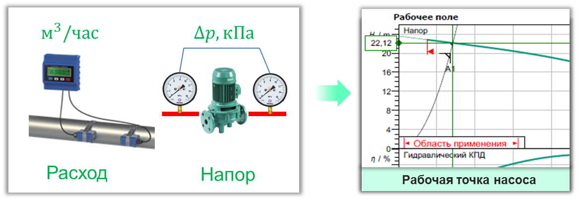 Насос имеет свою гидравлическую характеристику - зависимость напора от расхода. Рассчитав перепад давления на насосе, то есть его напор, с помощью напорно-расходной характеристики насоса можно оценить величину расхода и сделать вывод о правильности работы системы.