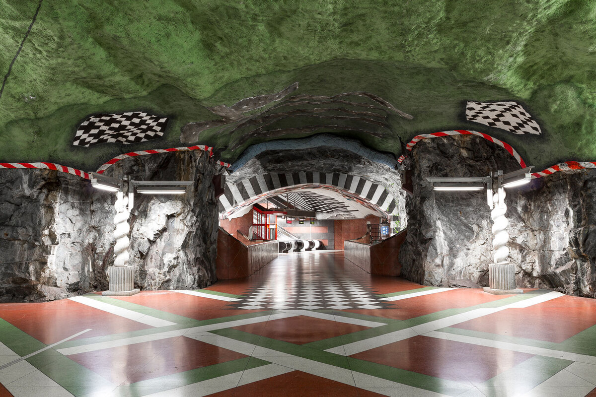 Solna centrum – яркая и довольно впечатляющая станция красного и зеленого цветов. Рисунки и объекты, которые ты здесь увидишь, связаны с проблемами защиты окружающей среды. Оформляли станцию в разные годы художники Karl-Olov Björk и Anders Åberg. Кстати, в районе станции Solna centrum находится куча кафешек и магазинов. Так что, если устанешь к этому моменту экскурсии – смело выползай из-под земли.