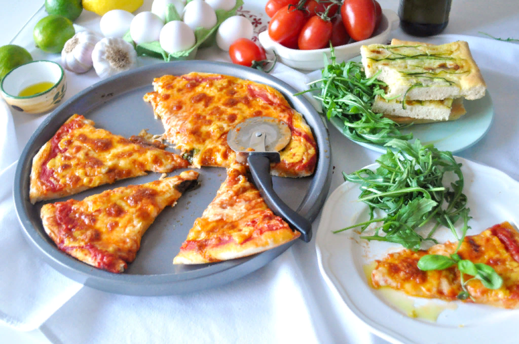 Ингредиенты для теста: 400 г простой муки 2л теплой воды (при необходимости вы можете отрегулировать количество) 2 чайные ложки сухих дрожжей соль 2 столовые ложки оливкового масла Из муки, воды, дрожжей, масла и соли сделайте эластичное тесто. Дайте ему подняться в теплом месте около 45 минут. Разогрейте духовку до 200 ° C. Тем временем, приготовьте ингредиенты для пиццы. Я использовала томатное пюре, различные виды сыра и пару листьев базилика для гарнира. Тесто нужно несколько раз ударить об стол, чтобы выбить лишний воздух и тесто было эластичным. Положите подготовленные ингредиенты на готовое тесто и поставьте в духовку, выпекать около 20 минут. Приятного аппетита!