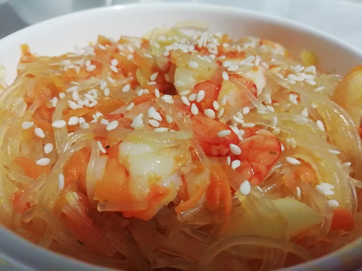 Как только надвигается гроза, я готовлю азиатскую лапшу. Сегодня по лунному календарю фунчоза с креветками. На 3 порции Фунчоза - 2 гнезда Морковь - 1 шт. Лук-порей - блюдце Креветки королевские - 250 гр. Специи - по вкусу Соевый соус - 2 ст. л. Технология 1. Очистите креветки. 2. Подготовьте овощи. 3. Замочите лапшу в кипятке на 5-7 мин. 4. Налейте на сковородку масло, добавьте специи (у меня 0,5 ч.л. овощной приправы и 1 ч.л. имбиря). 5. Обжарьте креветки до красного цвета со всех сторон. 6. Отложите на тарелку. В масле из под креветок обжарьте лук и морковь. 7. Откиньте лапшу на сито. 8. Добавьте на сковородку, перемешайте с овощами и креветками. 9. Добавьте 2 ст.л. соевого соуса, перемешайте и тушите на среднем огне под крышкой 5 мин.