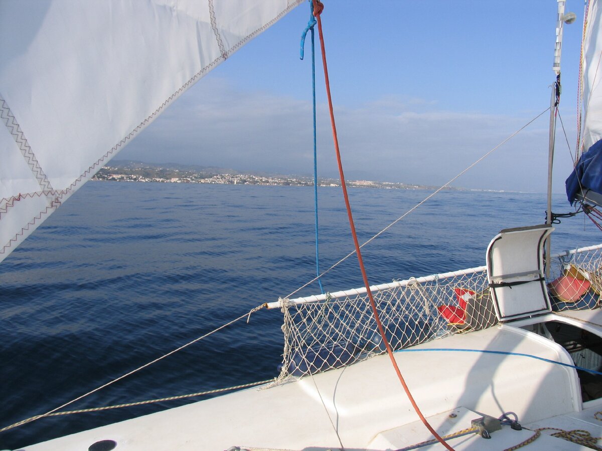 "Штиль" 09.04.2015 Денис разбудил меня уже в химуге. Я помню шесть лет назад он будил меня словами "Вставайте Пётр, нас ждут великие дела!!!!" Так будил кто то из приближенных Петра 1. Дождь, ветер. Денис не спал всю ночь, не давала уснуть не погода, и мысль вдруг нас сорвет с якоря и на камни. Я одеваю ОЗК. Раньше я его одевал на время, и очень быстро. Сейчас же я одел его наоборот)))) и причем заметил это где то через час. Быстро завтракаем, на "резинке" за оставленной вчера водой. И в путь. Шли сначала на моторе, потом под парусом, потом снова на моторе.... штиль одним словом. После полудня Денис ушел спать, я остался один. Ветер дул метра 3 в секунду. Пока денис спал я прошел километра 4-6. Видел дельфина, и кучу мусора. Весь день за катамараном тянулись два троллинга, ничего не поймали. Проснулся Денис, завели мотор. На моторе и дошли до "Марины". Стемнело. Встали у входа в Марину. На берег уже поздно. Прошли от Мотриля где то 70 км. Ужин, гитара и ром. Песни пели так, что н