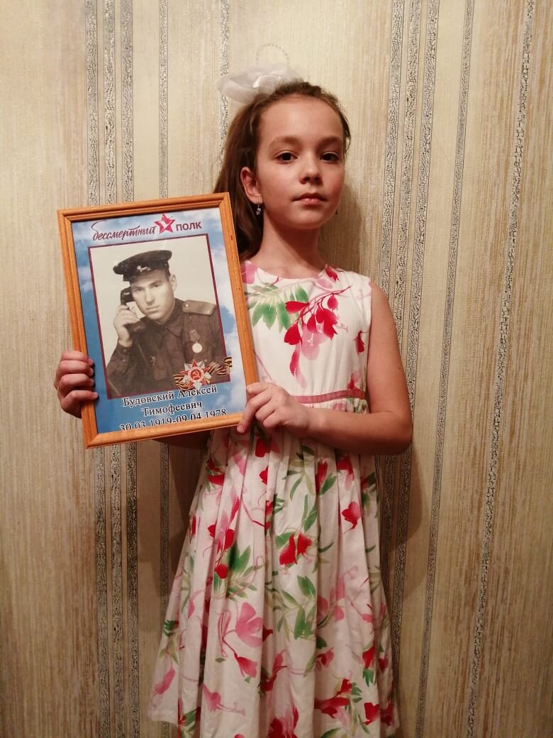 К 75-летию Победы Мария Илюшина, дочь сотрудника Управления Росгвардии по Омской области полковника Павла Илюшина приняла участие в региональной акции «Герои Победы», посвященной памяти участников Великой Отечественной войны, с доблестью выполнивших воинский долг. Мария Илюшина поделилась историей о своем прадедушке — Будовском Алексее Тимофеевиче. Прадедушка родился 30 марта 1919 года в деревне Сидоровка, Нижне-Омского района в крестьянской семье. Осенью 1939 года он был призван в ряды Советской армии на 2 года. Служил радистом на Дальнем Востоке, в городе Спасск — Дальний в артиллерийских войсках. Осенью 1941 года Алексей Тимофеевич должен был демобилизоваться и вернуться домой, но началась Великая Отечественная Война. Его полк отправили на Северный фронт. 1 сентября 1941 года принял свой первый бой с финнами. В 1942 году его полк отправили под город Мурманск, где Алексей Тимофеевич воевал с немецко-фашистскими захватчиками. В 1944 году полк прадеда перебросили в Румынию на третий Ук
