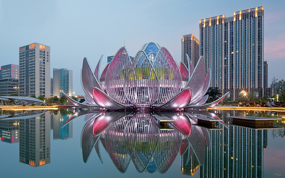 Чанчжоу – уникальный китайский город, в котором памятки старинной архитектуры гармонично сочетаются с инфраструктурой нового поколения. Находится он в провинции Цзянсу, известной далеко за пределами страны. Сегодня путешественников со всего мира привлекает в Чанчжоу The Lotus Building – культурный центр, возведенный в 2013 году. Он имеет форму трех лотосовых цветков в разных стадиях развития. Автор и создатель здания, которое не имеет аналогов на планете – австралийская компания 505 Studio. Она уже успела прославиться необычными проектами, но в этот раз превзошла саму себя. Здание центра расположено посреди водной глади, как и настоящие бутоны лотоса в природной среде. Глядя на него кажется, будто перед вами произведение искусства, а не обычное функциональное здание. Максимально приблизить его внешний вид к реальному цветку удалось благодаря тщательно подобранным материалам. Облицовка выполнена с мозаичных плит бледно-розовых и нежно-бежевых оттенков. Они создают виз