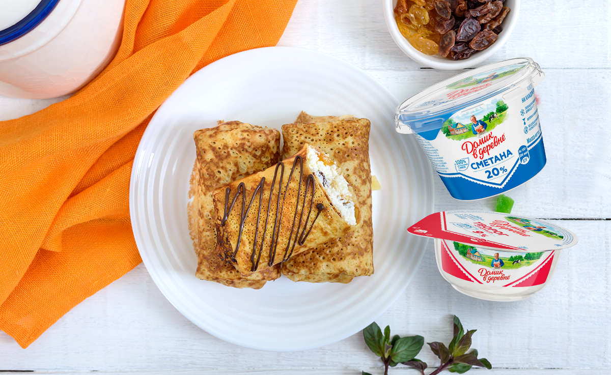 2. Чтобы начинка блинчика получилась сочной, используйте густую сметану и творог с высоким процентом жирности. Оба продукта я беру от «Домик в деревне», так как в качестве этого бренда я уверен на все 100 %.