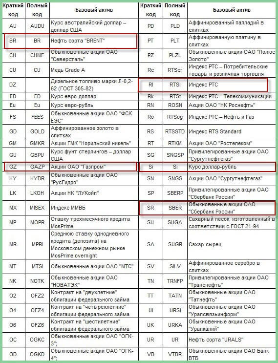 Например, если фьючерс имеет полный код «RTS-12.14», он означает что контракт на индекс RTS будет завершен в декабре 2014 года, и краткий код «RIZ4», где «RI» — это опять же, контракт на индекс RTS, «Z» говорит о том, что это декабрь, а «4» — это последняя цифра года (2014). Более подробно об расшифровке читайте в этой статье.