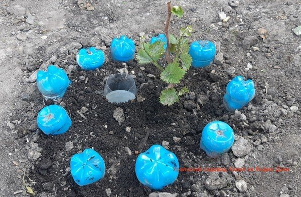 Приветствую вас, уважаемые огородники))) Мы живём в зоне рискованного земледелия, но даже в таких условиях очень хочется выращивать южные культуры. Например, виноград. Несколько лет назад мы посадили наш первый куст винограда, не в теплицу, а просто на улицу. Через три года он стал плодоносить. Ещё через годы мы собрали самый большой его урожай - 2 тазика ягод. Рады были безмерно. Но, пару лет назад он у нас вымерз, видимо закрыли на зиму не очень хорошо. И вот, принимая во внимание наш прежний опыт и посоветовавшись с местным агрономом, который с успехом выращивает виноград у себя на участке, мы приобрели у него раннеспелый сорт "Преображение". Этот сорт выведен путем скрещивания известных сортов «Талисман» и «Кишмиш лучистый», он очень неприхотливый и урожайный. Я упущу все нюансы посадки винограда, его полива и подкормок, а раскажу только для чего мы вкопали в лунку при посадке винограда синие бутылки. А бутылки вкапывают для того, чтобы получить урожай на 10 дней или даже на 2 нед