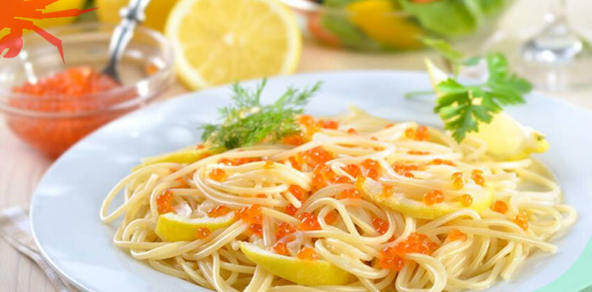 Ингредиенты: Берем кастрюлю, наливаем в нее воду и ставим на огонь. Как только вода закипела, подсаливаем и кладем спагетти. Варим до готовности. Делаем соус: берем глубокую миску, кладем сметану и добавляем сливки (сливки лучше взять густые), хорошо перемешиваем. Мелко нарезаем укроп и добавляем к смеси сметаны и сливок. Затем солим и перчим по вкусу. Немного подогреваем и соус готов. Выкладываем на блюдо спагетти, поливаем соусом и сверху кладем красную икру. Если есть желание можно украсить: зеленью, дольками лимона, лайма. Блюдо готово. Приятного аппетита! Источник: https://wildcrab.ru/news?id=604