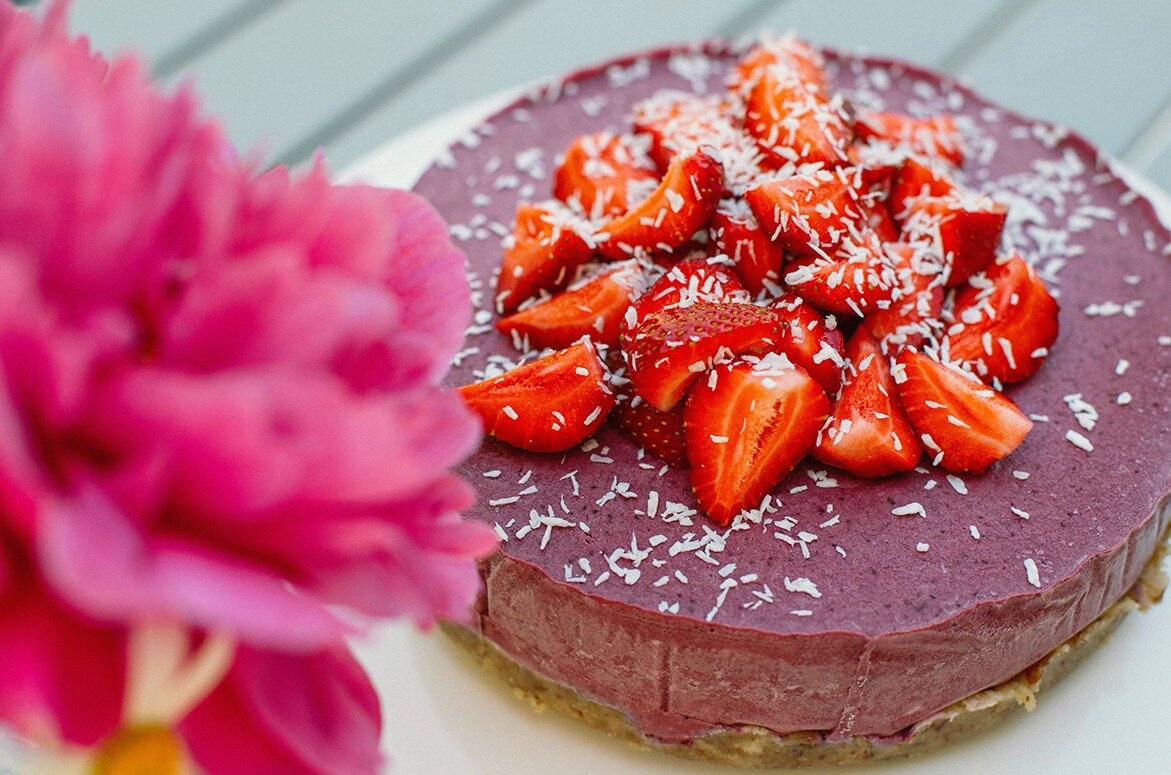Свежий сырой пирог со вкусом лимона и свежими ягодами прекрасно подходит для летнего десерта. Этот торт также имеет такое сырье, что его легко найти каждому в обычном продуктовом магазине. В качестве подсластителя на торт действуют только банан, мед и летние свежие ягоды. Торт будет замерзать в морозильной камере в течение нескольких часов перед подачей на стол, а орехи кешью следует замочить в воде, предпочтительно на ночь. Поэтому для этого нужно зарезервировать немного времени, хотя в остальном его легко приготовить с помощью блендера. Должен признаться, что до создания этого рецепта я не был большим поклонником сырых тортов но после того как я его попробывал мое мнение изменилось. Я сделал торт диаметром 20 см, но если делать в меньшем диаметре то торт будет выше и эффектнее. Чернично-клубничный сырой торт Примечание: орехи кешью, необходимые для рецепта, должны быть замочены на ночь в воде,поэтому оставьте достаточно времени для выпечки. Основа: Заполнение: Для украшения: Мелко на
