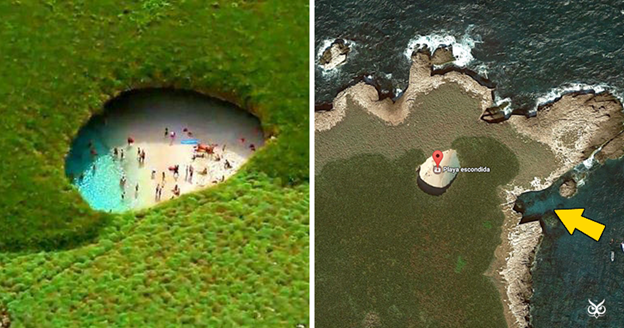 Зияющая дыра в поверхности пышного зеленого острова открывает тайный пляж с обильной тенью, солнцем и кристально чистой водой. Playa del Amor, широко известный как Скрытый пляж, является особенностью одного из островов Мариета (Marieta Islands), расположенного примерно в 22 морских милях к западу от Пуэрто-Вальярты, Мексика, в устье залива Бандерас. Со стороны он похож на место из фантастического романа: широкая песчаная пещера, в которую врываются голубые воды Тихого океана. Острова Мариета - это группа необитаемых островов, образованных подводными извержениями вулканов. Эти острова - это настоящее чудо природы, но вот пляж возник не в результате вулканической активности. Ходят слухи, что дыра, образовавшая Скрытый пляж, стала результатом взрыва бомбы. Острова Мариета всегда были совершенно необитаемы, что делало их идеальным местом для военных испытаний мексиканского правительства. Оружие и артиллерия испытывались на этих островах начиная с начала 1900-х годов, на безопасном рас