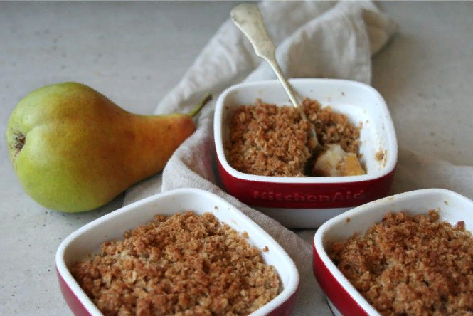 Ингредиенты: (на 4 персоны) 1) 2 груши (около 500 г, можно даже чуть больше) 2) 1 пл тростникового сахара 3) 2 ПЛ лимонного сока 4) 70 г сливочного масла 5) 70 г мелкой овсянки 6) 50 г панировочных сухарей из сухого Рождественского торта (примерно 3 ломтика) 7) 50 г тростникового сахара 8) 1/2 ст. л. корицы 9) щепотка молотой гвоздики или кардамона 10) щепотка соли + масло, чтобы очистить противень Начните разогревать духовку до 180 градусов. Смазать форму для запекания размером до 20 х 20 см сливочным маслом. Я использовал 4 кухонные миски для выпечки, 9 х 9 см каждая. Смешайте все ингредиенты в миске вместе. С сахаром, однако, следует обращаться осторожно, особенно если вы будете также добавлять его к грушам. Очистите груши, но не очищайте их от кожуры. Нарежьте их кубиками и смешайте с лимонным соком и сахаром. В пределах двух третей высоты формы для запекания сверху выложите груши и равномерно накройте их спринклером. Выпекать при температуре 180 градусов около 15-20 минут. Вы